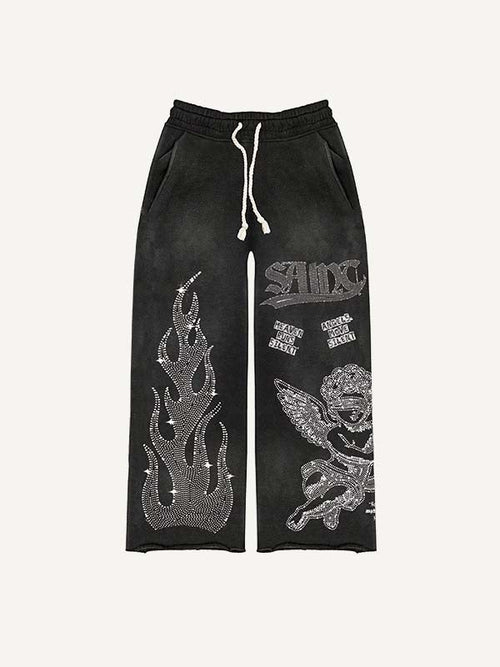 Pantalones con cintura elástica y estampado de calcomanías falsas con diseño de mitad ángel y mitad demonio, alas, esqueleto, fuego, nieve, espada, cruz y letras. -