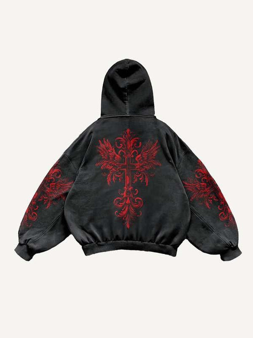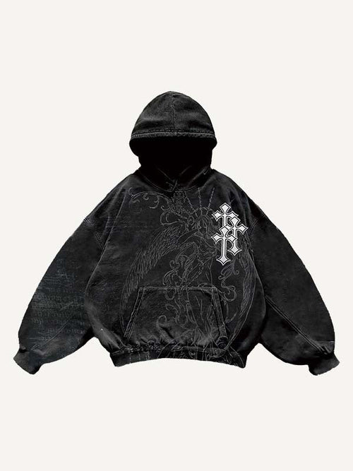 Sudadera con capucha con estampado de calcomanías falsas, mitad ángel, mitad demonio, alas, esqueleto, fuego, nieve, espada, cruz y letras, en bloques de color -